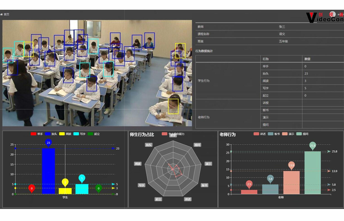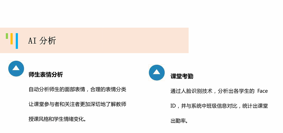 AI學情分析系統采用前端采集后臺分析的方案,前端教室可對接高清監控攝像機,如大華、宇視、天地偉業等,無需專業考勤攝像機,學生攝像機基礎要求:視場角120度,分辨率:4k,支持攝像機復用和利舊。 AI學情分析系統也支持對接常態化錄播系統,提供定制化解決方案,可直接對接錄播主機,實現圖像傳輸和分析。