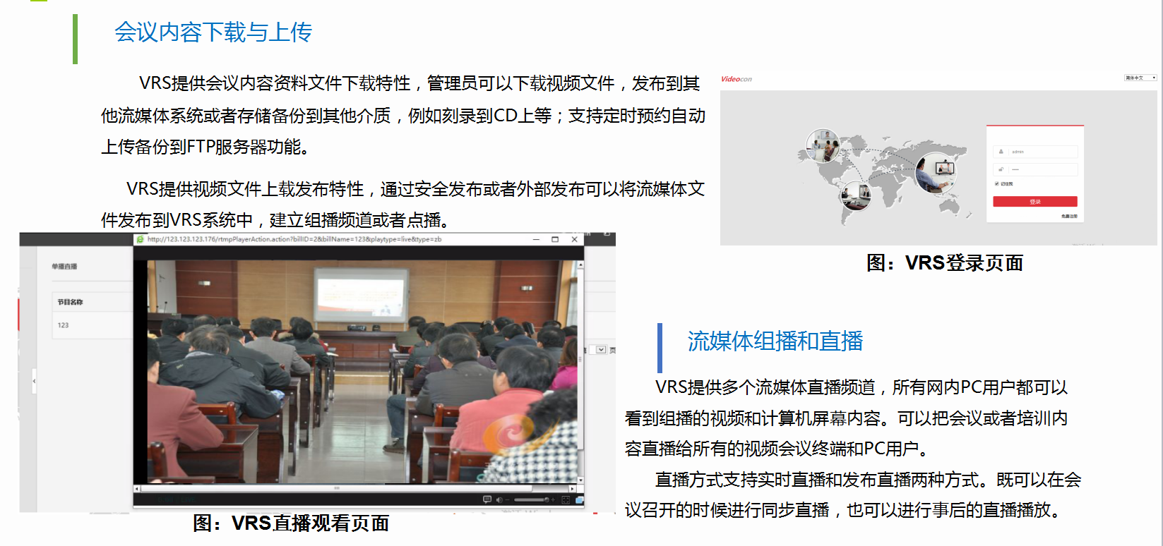 該服務器可以兼容各種主流H.323視頻會議終端和標準MCU,完成音視頻和數據內容的實時錄制、存儲、流媒體發布、在線點播回放等強大功能,性能穩定,使用方便,易于管理。VRS?是綜合視頻會議技術和流媒體技術的錄播產品。